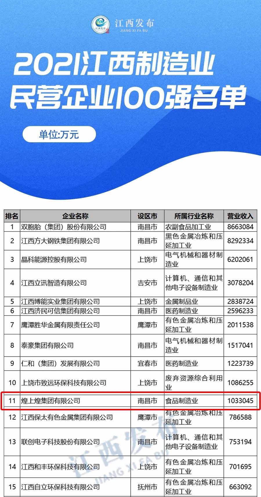 喜訊 | 煌上煌集團(tuán)斬獲2021“江西民營企業(yè)100強(qiáng)”“江西制造業(yè)民營企業(yè)100強(qiáng)”
