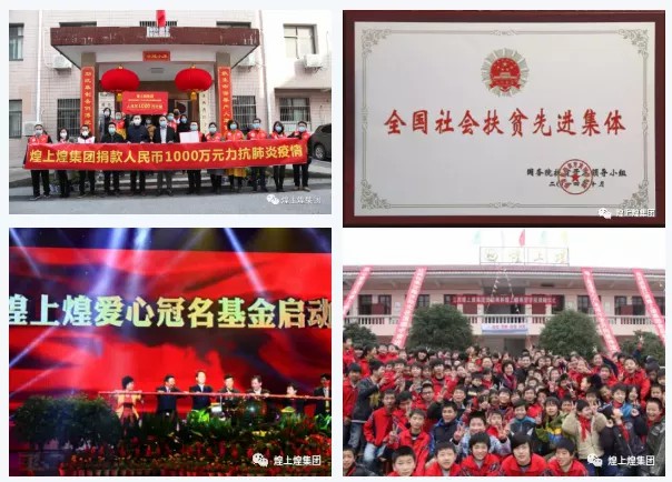 集團(tuán)積極謀求多元經(jīng)營,在全省范圍內(nèi)聯(lián)接培育了27個肉鴨養(yǎng)殖專業(yè)合作社;全資打造“江西茶百年油脂有限公司”,規(guī)劃在全省各地建設(shè)高產(chǎn)優(yōu)質(zhì)油茶基地2萬畝;全資打造江西煌盛房地產(chǎn)開發(fā)有限公司、萍鄉(xiāng)武功山溫泉君瀾度假酒店等多個項(xiàng)目;2016年,集團(tuán)響應(yīng)“一帶一路”國家發(fā)展戰(zhàn)略,成功與新西蘭新溪島公司合作簽訂麥盧卡蜂蜜項(xiàng)目;2017年,集團(tuán)產(chǎn)業(yè)鏈逐步向文化產(chǎn)業(yè)延伸,全面做好煌上煌醬鹵文化館、非物質(zhì)文化博物館、企業(yè)黨群文化館,“三館一體”文化產(chǎn)業(yè)全面起航;近年來,煌上煌成立了集團(tuán)餐飲事業(yè)板塊,目前形成了江西合味原酒店管理有限公司、江西新煌廚餐飲有限公司、江西煌家徐媽鹵汁拌粉品牌運(yùn)營管理公司三大品牌,助推江西贛菜品牌三年行動計(jì)劃實(shí)施。煌上煌致富思源,熱心公益慈善事業(yè),積極承擔(dān)社會責(zé)任。累計(jì)帶動下崗員工1萬余人就業(yè);在全省捐建6所希望學(xué)校;帶動農(nóng)戶3萬余戶,累計(jì)增收3億元;2020年新冠疫情發(fā)生后,第一時間向省紅十字會捐款1000萬元用于抗擊疫情,同時總共分四批次向湖北捐贈產(chǎn)品2萬余份,另有口罩、真真老老產(chǎn)品等醫(yī)用物資,總計(jì)折合人民幣200多萬元。數(shù)年來為抗洪抗震救災(zāi)、扶貧修橋修路、資助失學(xué)兒童,興辦希望小學(xué)等,累計(jì)捐款捐物達(dá)8000多萬元,被國務(wù)院扶貧開發(fā)領(lǐng)導(dǎo)小組評為“全國社會扶貧先進(jìn)集體”。并于2013年成立了煌上煌愛心基金會,標(biāo)志著煌上煌向愛心事業(yè)代代相傳進(jìn)行到底。