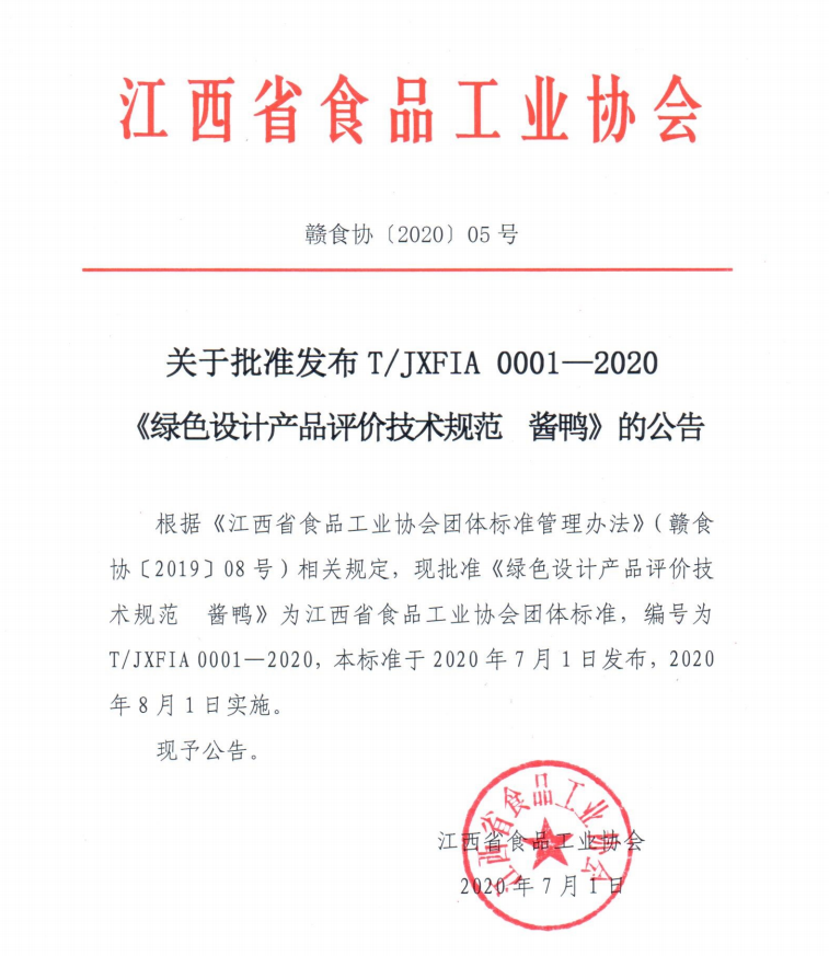7月1日,《綠色設計產品評價技術規范 醬鴨》團體標準正式發布,該標準由江西省食品工業協會牽頭,江西煌上煌集團食品股份有限公司、南昌...