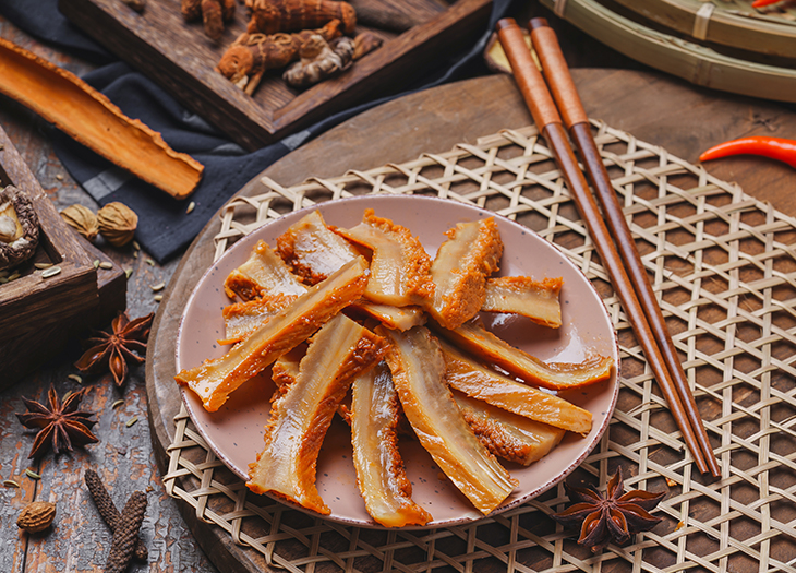 精選高安產(chǎn)特級腐竹,經(jīng)浸泡、濃湯鹵制而成。產(chǎn)品色澤金黃,包含鹵...