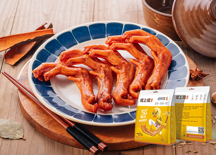 產品介紹:精選體型粗壯的新鮮鴨腳,去凈角質皮,蹼皮厚實。采用20多種中藥、香辛料鹵制而成。產品色澤金黃誘人,香氣飽滿,蹼皮厚實,富有嚼勁。鮮香風味物質滲透在趾骨之中,越啃越有味。產品分清香、微辣、重辣三種,適合不同嗜辣消費群體。香鹵鴨腳是煌上煌的重點暢銷的產品之一,是公司的招牌產品,也稱為招牌鴨掌。